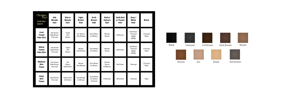Available in 9 shades: Dark Brown, Brown, Taupe, Black, Irid Brown, Tan, Bronze, Charcoal and Ash Brown.